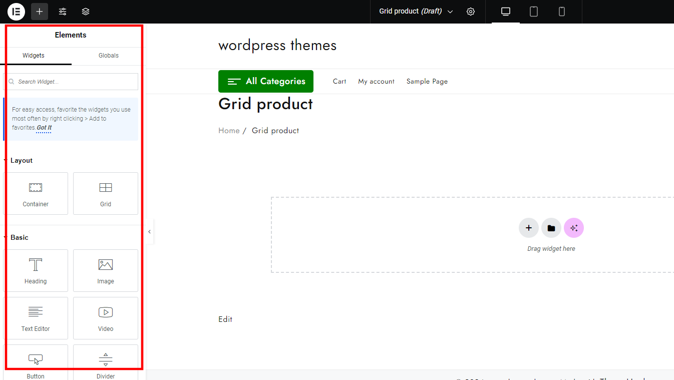 In the Elementor panel, search for “Grid Product” (this widget is available in Elemento Addons).