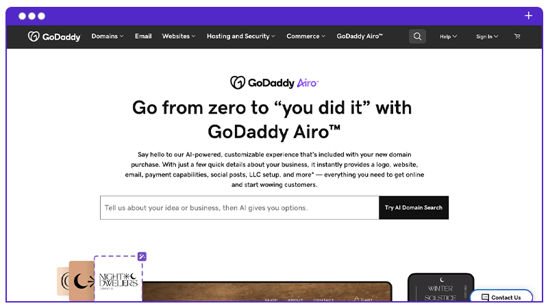GoDaddy Airo includes additional features like AI-generated logos, social media ads, email marketing, and much more.