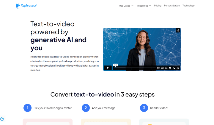Rephrase is a text-to-video generator powered by AI. It can create professional videos with digital but real-looking avatars. It offers some avatars that you can choose from.