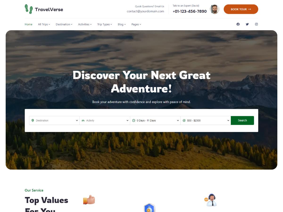 The theme is also compatible with powerful industry plugins like WP Travel Engine. This integration allows you to create unlimited trip itineraries, destinations, and trip types.