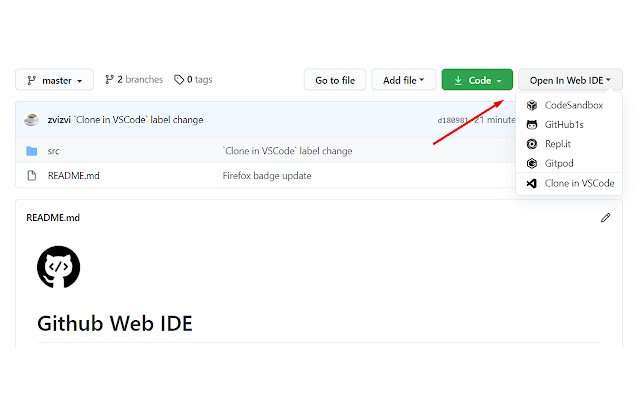 This extension adds to any GitHub repository a new drop-down menu that offers links to a number of online services that allow viewing the source code of the repository in an IDE-like interface.