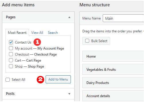When you click on the new menu, the Contact Us page should appear to add. Click on the Contact Us page and assign it to Menu.