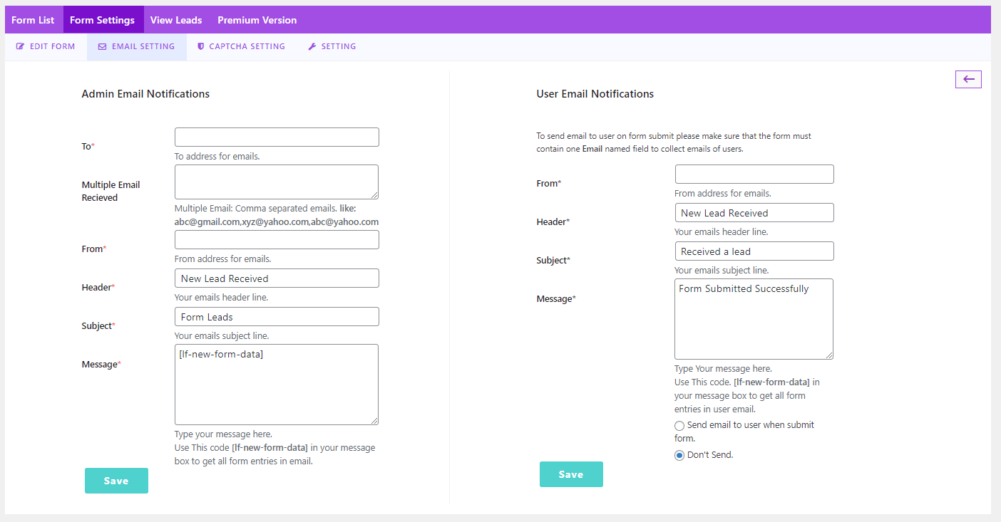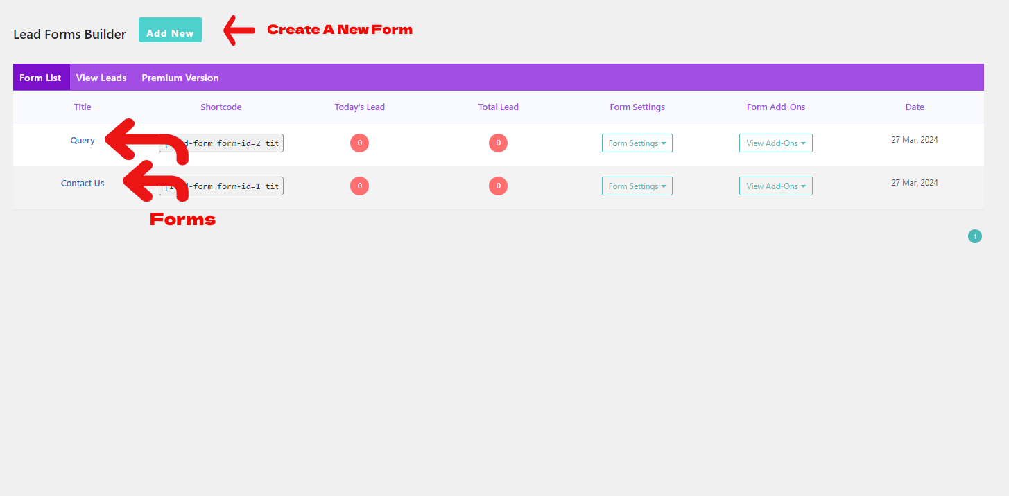 By clicking on Add New you can create new forms and add them on various pages for various purposes.