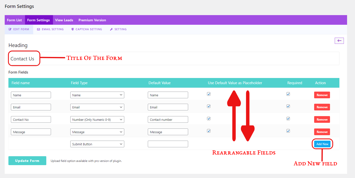 Here you can customize the Contact Form. From adding new fields to arranging them in order you can edit them.