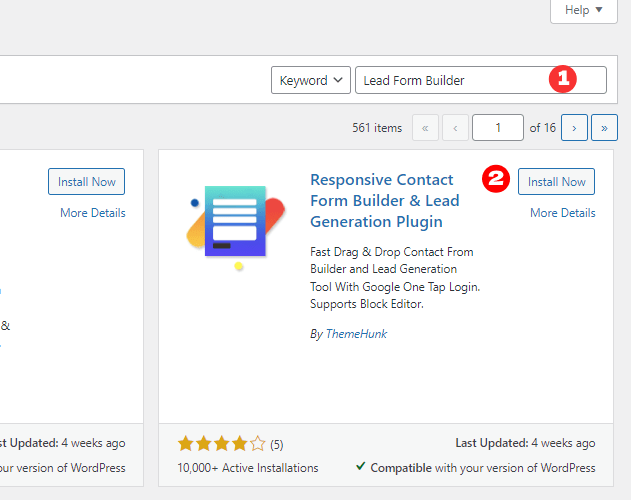 You will find the search bar on the top right side. Search for the Lead form builder. Seek the plugin titled “Responsive Contact Form Builder & Lead Generation Plugin”. Click on Install Now.
