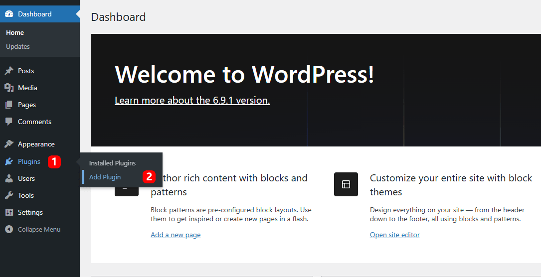 • Step 1:  Go to your Wp Dashboard > Wp Admin Plugins > Add New.