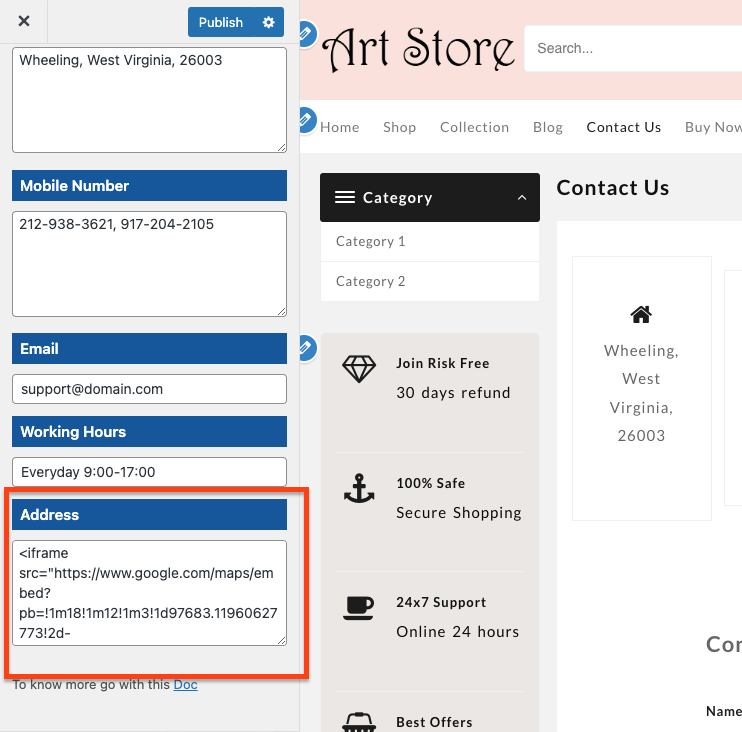 Right Column – Here you can add call to action Button text, number and Email details.