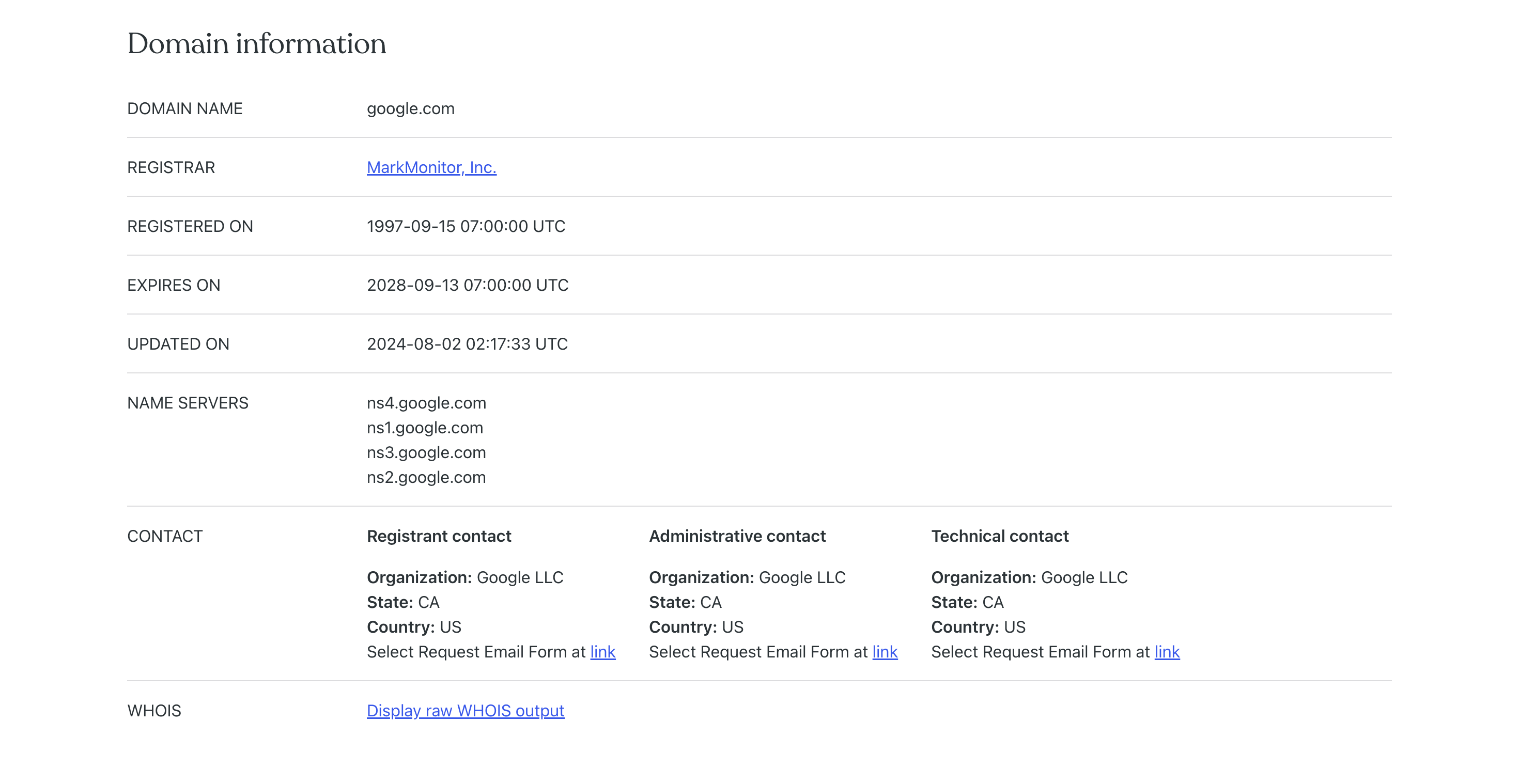 - Admin and Technical Contacts – Contact details of the people managing the domain, including technical support.