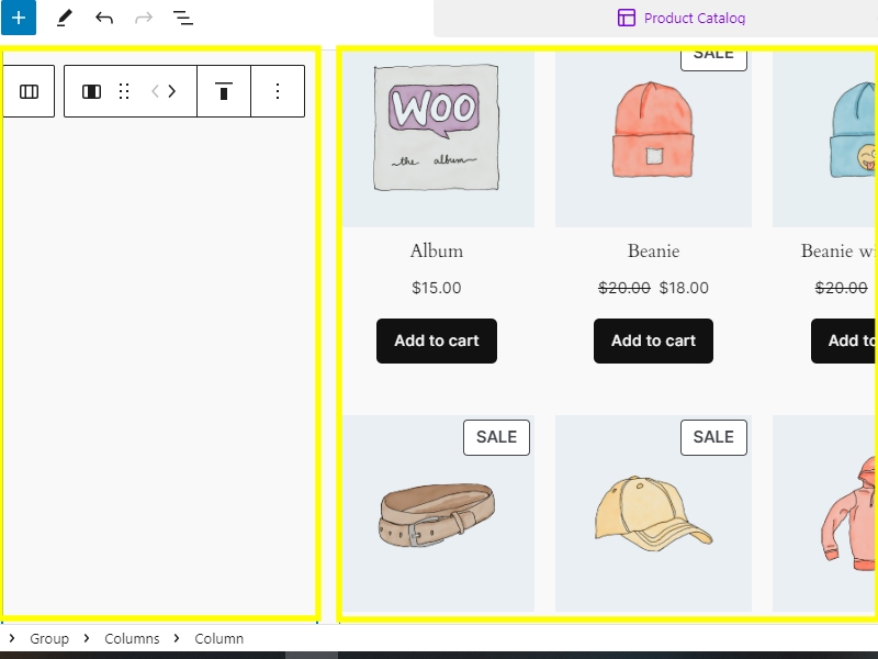 Click on the column or wherever you want to add a Product filter, then select the “Add block” option.