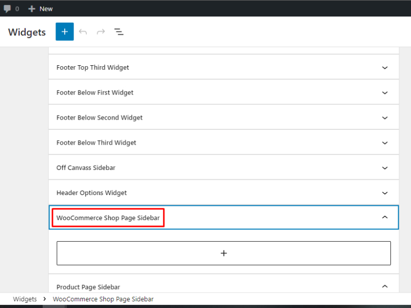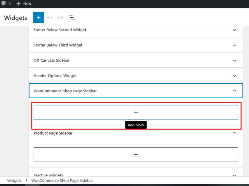 After clicking on the “Woocommerce shop page sidebar” you can see “plus” (+) it’s an Add block option.