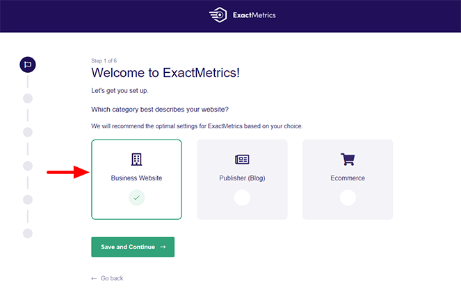 Now choose a category for your website from a business website, blog, or eCommerce. Select one and then click on the ‘Save and Continue’ button.