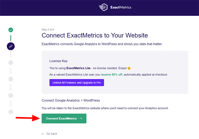 Now click on the button Connect ExactMetrics and continue. As shown below image.