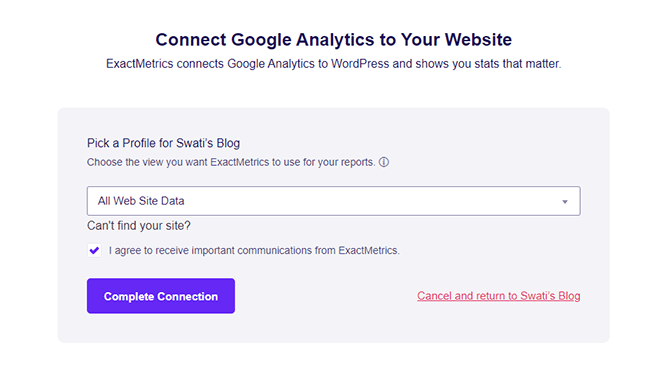 Now, this is the final step of connecting Google analytics. You need to select your website here and click the ‘Complete Connection’ button to continue.