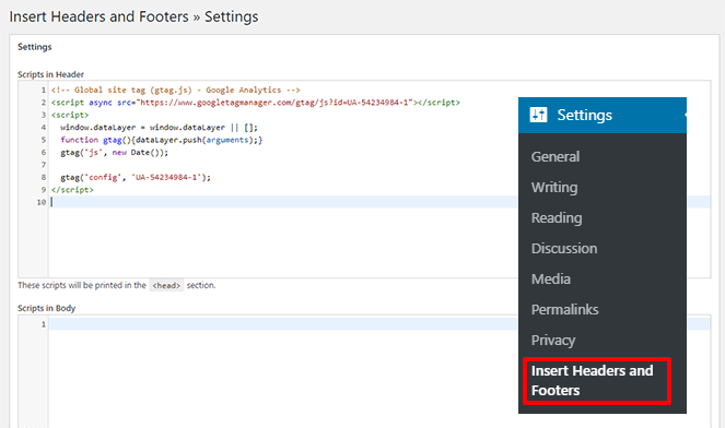 Now, You need to install and activate the Insert Headers and Footers plugin. After that Go to Settings > Insert Headers and Footers page.