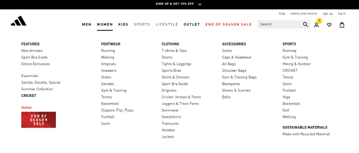 Adidas, a leading athletic brand, has a well-designed mega menu on its website that provides an efficient and user-friendly way to navigate through its wide range of products and categories.