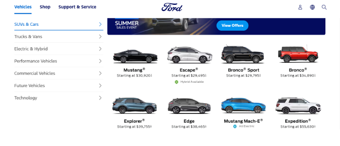 This mega menu is designed to showcase the wide range of vehicles and services offered by Ford in a visually appealing and user-friendly manner.