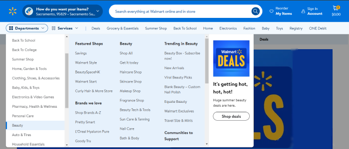 Walmart mega menu is a dynamic and visually appealing navigation menu structure implemented on the Walmart website to help visitors easily and efficiently navigate through the various product categories and sections available on the site.
