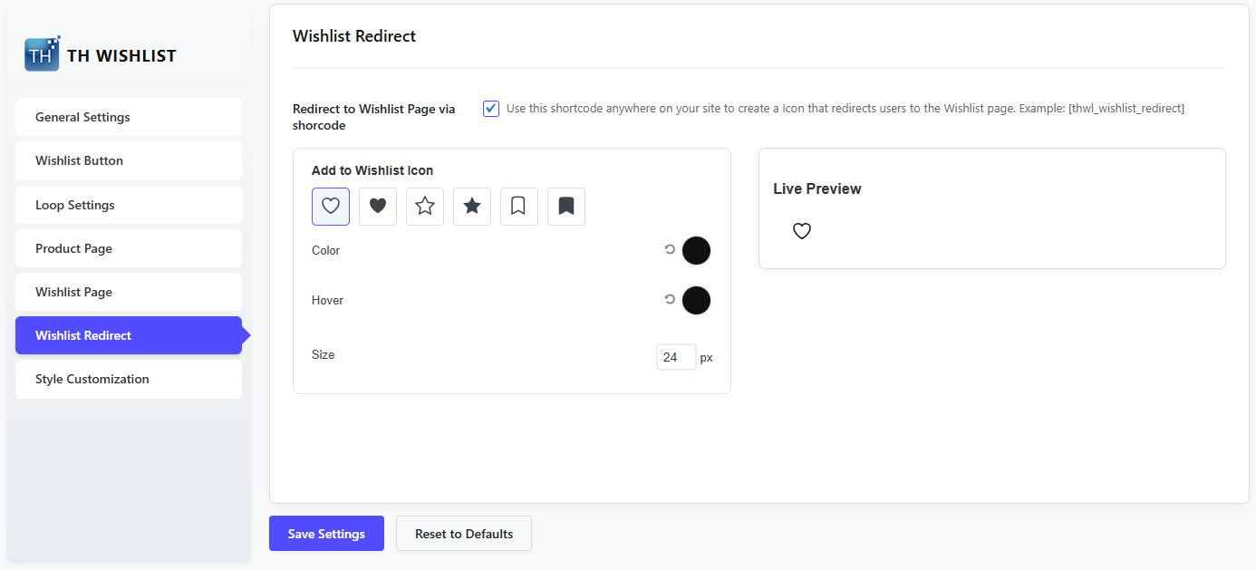 If you want to redirect users to the wishlist page via an icon, enable this button and put the shortcode where you want to show it.