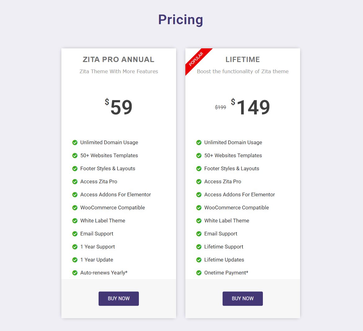 On the Zita page, scroll down to pricing and choose a plan. Proceed with the steps and purchase the pro theme.